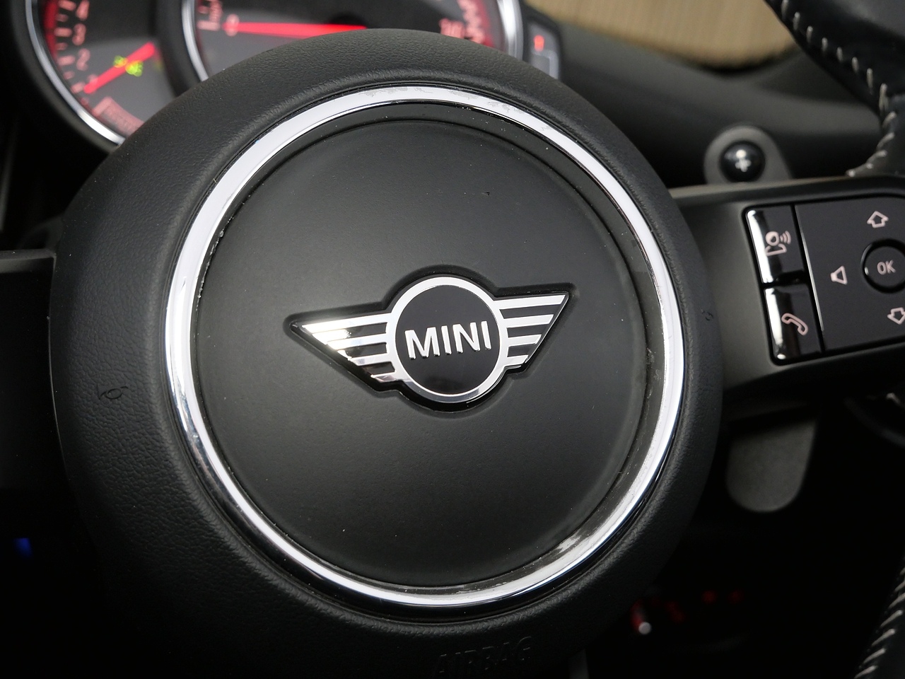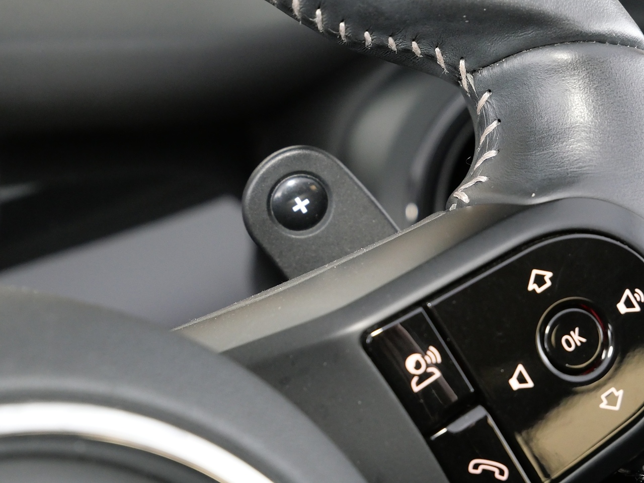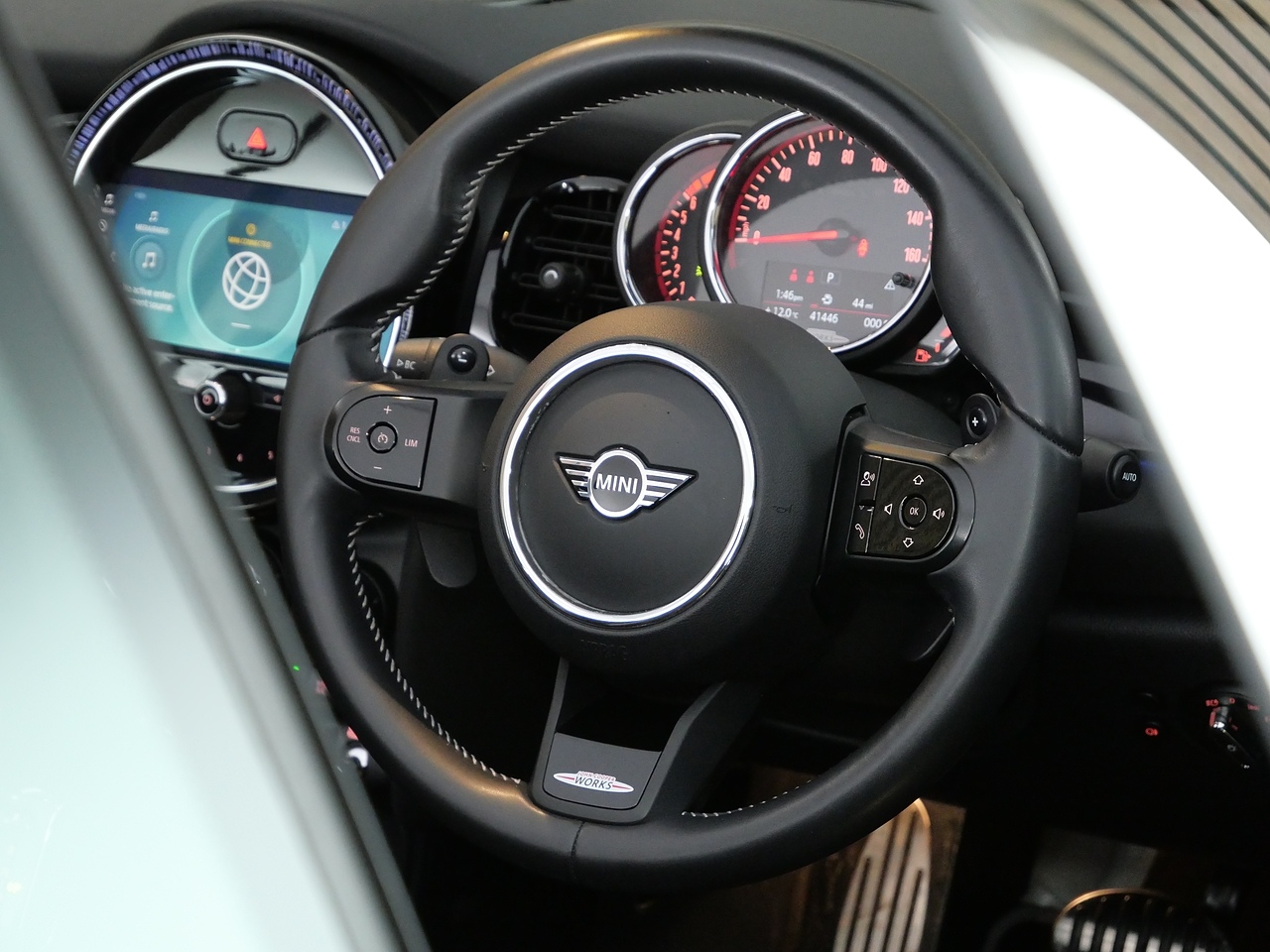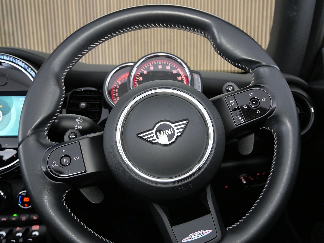 • Walknappa Leather Steering Wheel with Grey Seam - John Cooper Works Badge on Piano Black Lower Steering Wheel Spoke